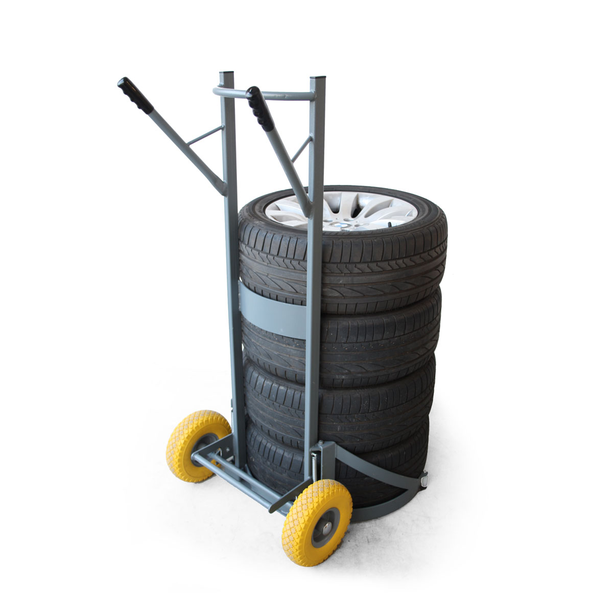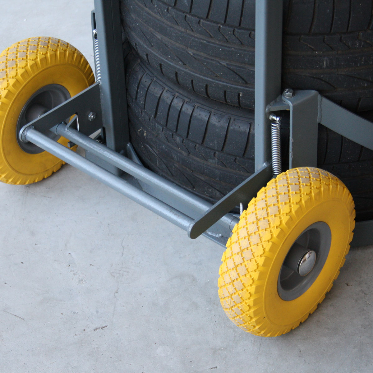 Grazie al sistema basculante brevettato e al meccanismo di presa e rilascio automatico, consente al gommista di sollevare e trasportare ruote pesanti in modo ergonomico e sicuro.