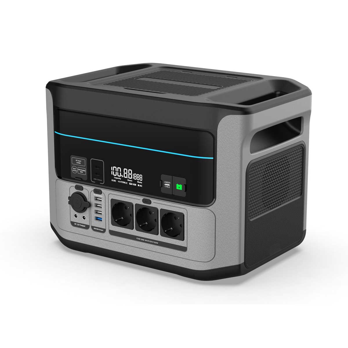L’inverter integrato da 1500W a Onda Sinusoidale Pura (3000W di picco) consente di alimentare correttamente dispositivi elettronici sensibili e utensili elettrici tramite 3 prese Schuko 220V 50Hz.